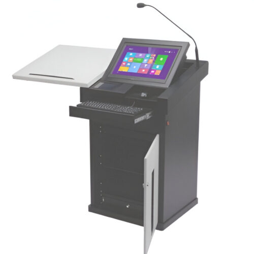 Introducing the Saatvik Electronic Lectern or Digital Podium, a state-of-the-art presentation solution designed with modern technology and style. Crafted from MDF with a Deco Paint finish, this podium features a lockable caster wheel for mobility and security. The podium is equipped with a motorized tiltable monitor, space for a CPU, keyboard & mouse, and a laptop tray. It also features an inbuilt 120-watt amplifier, two wall speakers, a gooseneck microphone, a wireless handheld microphone, and a wireless collar microphone, offering a comprehensive presentation solution. The podium also includes a Thin Client CPU-i3 processor, 2GB RAM, 1TB HDD, wifi, Bluetooth, wired keyboard & mouse, and AV connectivity– VGA, HDMI, USB, Aux, XLR, RJ45 Power socket, VGA switcher, and a 21.5” Touch Screen Monitor. In terms of dimensions, the podium measures 47″ in height, 26″ in width, and 22″ in depth, and weighs approximately 50 Kg, offering ample space without compromising on style. Optional items such as a visualizer (document camera), projector, UPS, speaker, etc. are available for those looking to enhance their presentations. This podium is perfect for a variety of settings including auditoriums, schools, institutions, colleges, universities, churches, conference rooms, and more. Please note: Due to continuous product development, specifications may change without prior notice. The product images are for illustrative purposes only and may differ from the actual product. Elevate your presentations with the Saatvik Electronic Lectern or Digital Podium, where modern design meets functionality.