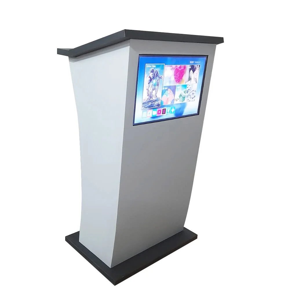 This podium features a built-in 21.5-inch LED display powered by an Android media player, allowing you to: